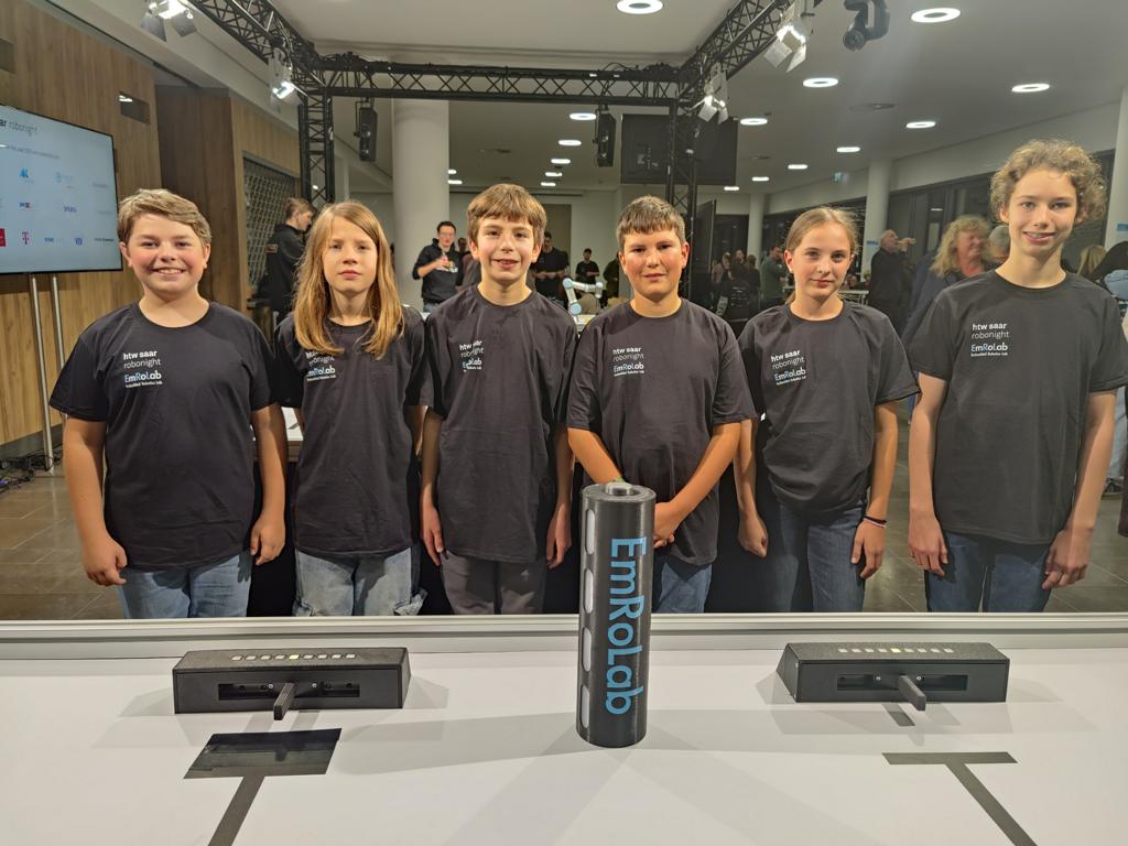 Das Training in der Robotik-AG und in den HTW-Workshops hat sich gelohnt: Am Samstag, 30.08.2025, schafften alle drei teilnehmenden GSG-Robotik-Teams die Qualifikation zur HTW RoboNight am 08. November 2025. 16 Teams aus dem gesamten Saarland waren angetreten und hatten drei Stunden Zeit für die Lösung von drei Robotik-Parcours. Die 10 besten Teams erhielten das Ticket zur HTW RoboNight, darunter auch die noch zu den eher jüngeren Teilnehmern gehörenden GSGler: Auf dem Foto sind dies v.l.n.r. Team DKWDTNP mit Silas Kläs (Kl. 6) und Ben Fass (Kl. 8), Team RoboSoJus mit Sophie Paulus und Justus Thewes (beide Kl. 8), sowie Team Jeffrey mit Loris Hermann und Jante Schwarz (beide Kl. 6). Jetzt steht weiteres Training mit Betreuerin Margit Becker-Peters auf dem Programm und dann wieder viel Spaß bei der Teilnahme an der HTW RoboNight. Die ganze Schulgemeinschaft drückt die Daumen!n