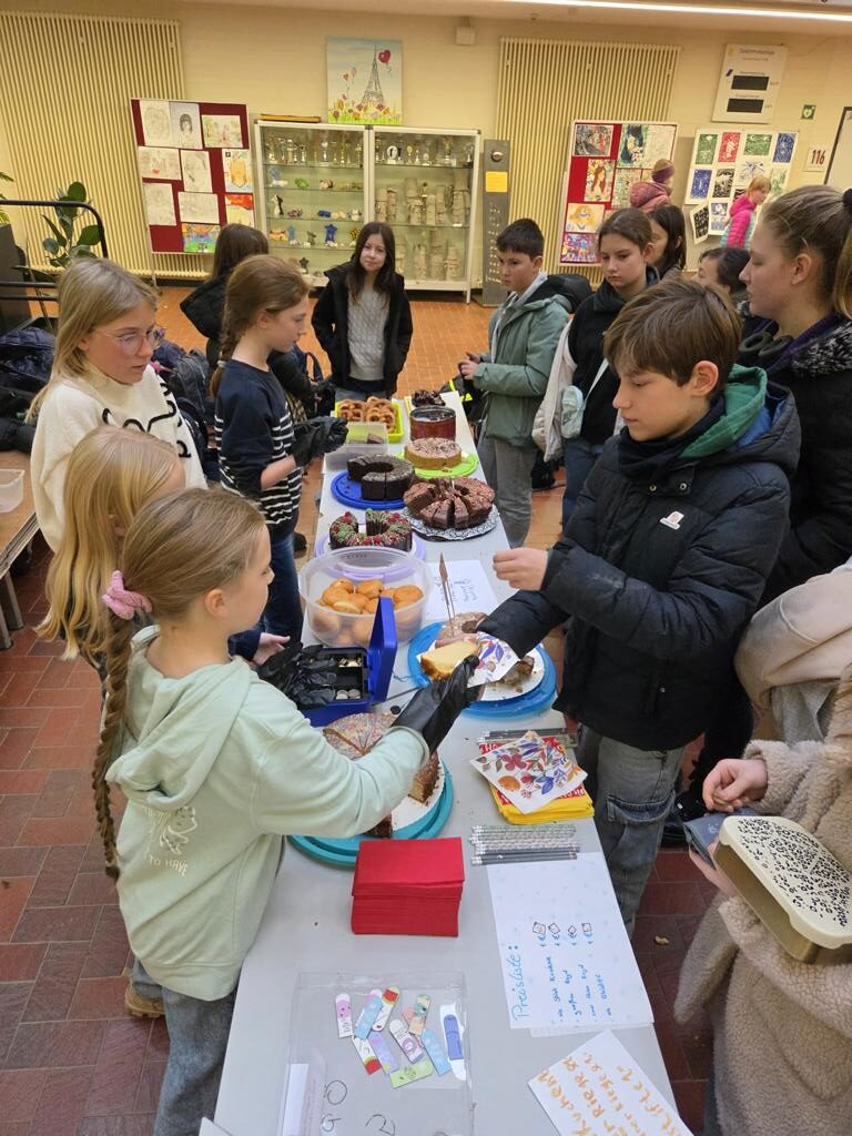 Deshalb wurden die Klasse und die AG aktiv: Fleißig wurden Kuchen, Brezeln und Berliner gebacken, und in der AG Schlüsselanhänger geknüpft. Schon konnte die Verkaufsaktion starten.