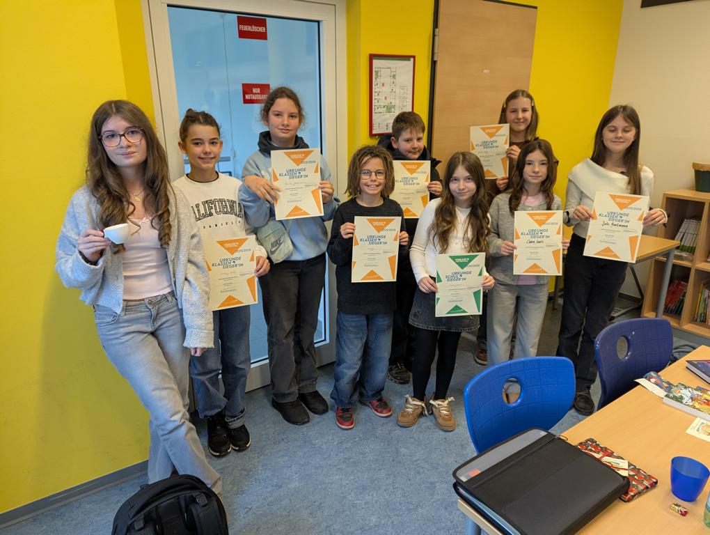 Das erste Foto zeigt die Klassensieger und –siegerinnen kurz vor dem Start (von links nach rechts): Emilia Jung, Paula Stegemann (beide 6c), Marc Guillard (6e), Emil Wörner (6b), Emilia Meeß (6a), Pauline Ziegler (6e), Clara Louis, Jule Hartmann (beide 6d), Nils Pörtner (6a), Henri Michels (6b), das zweite Foto die Schulsiegerinnen: In der Mitte Pauline Ziegler (mit der grünen Urkunde), links die Vorvorjahressiegerin Louisa Ziegler samt Lesekerze Brigitte A. in einer Espressotasse.