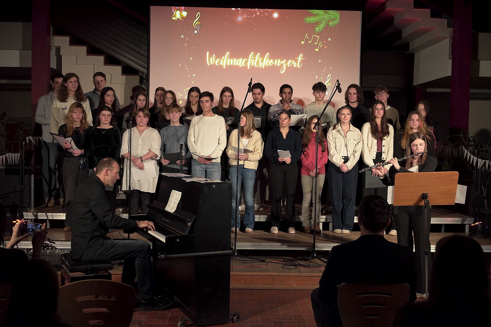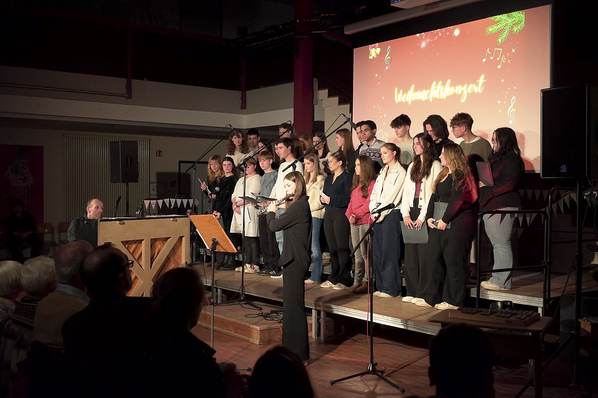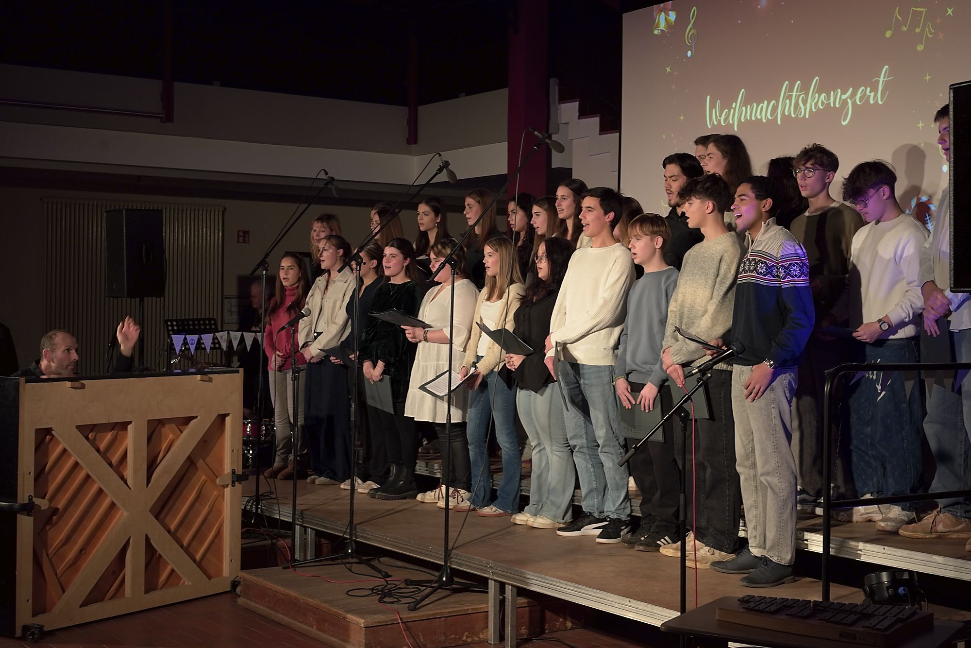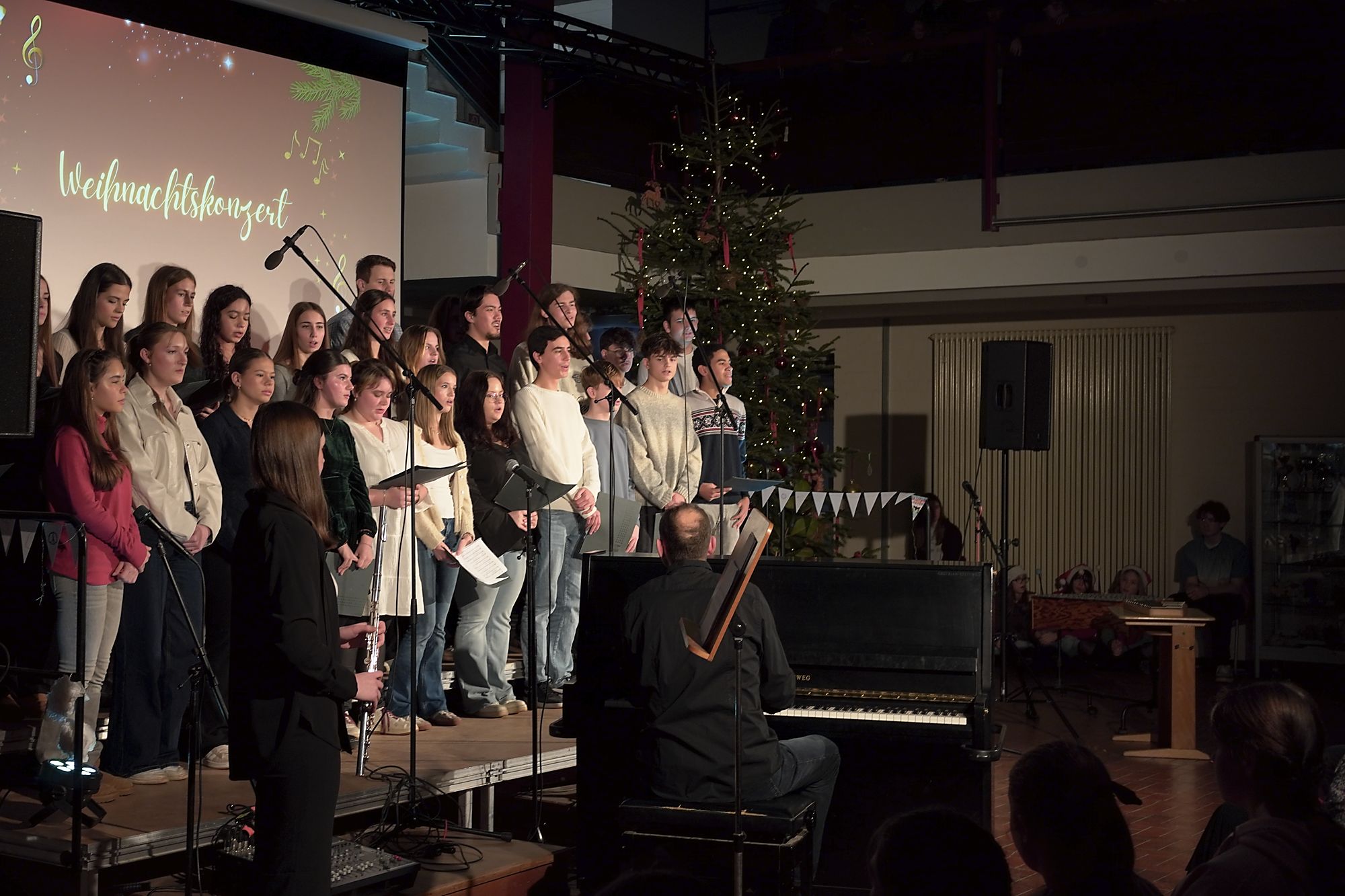 Im großen Finale traten Unterstufen- und 11er-Chor gemeinsam auf die Bühne und schlossen das Konzert mit „Happy X-Mas“ sowie weiteren Weihnachtsliedern zum Mitsingen für alle.