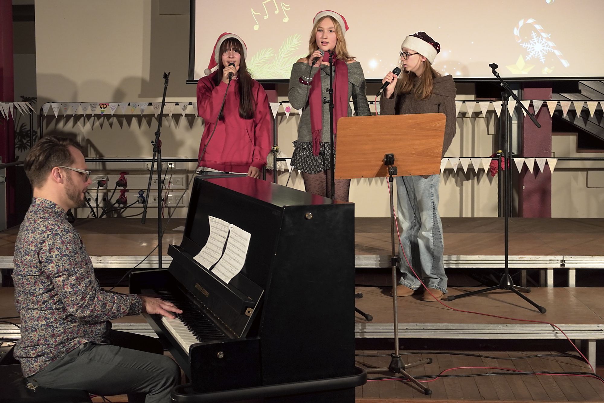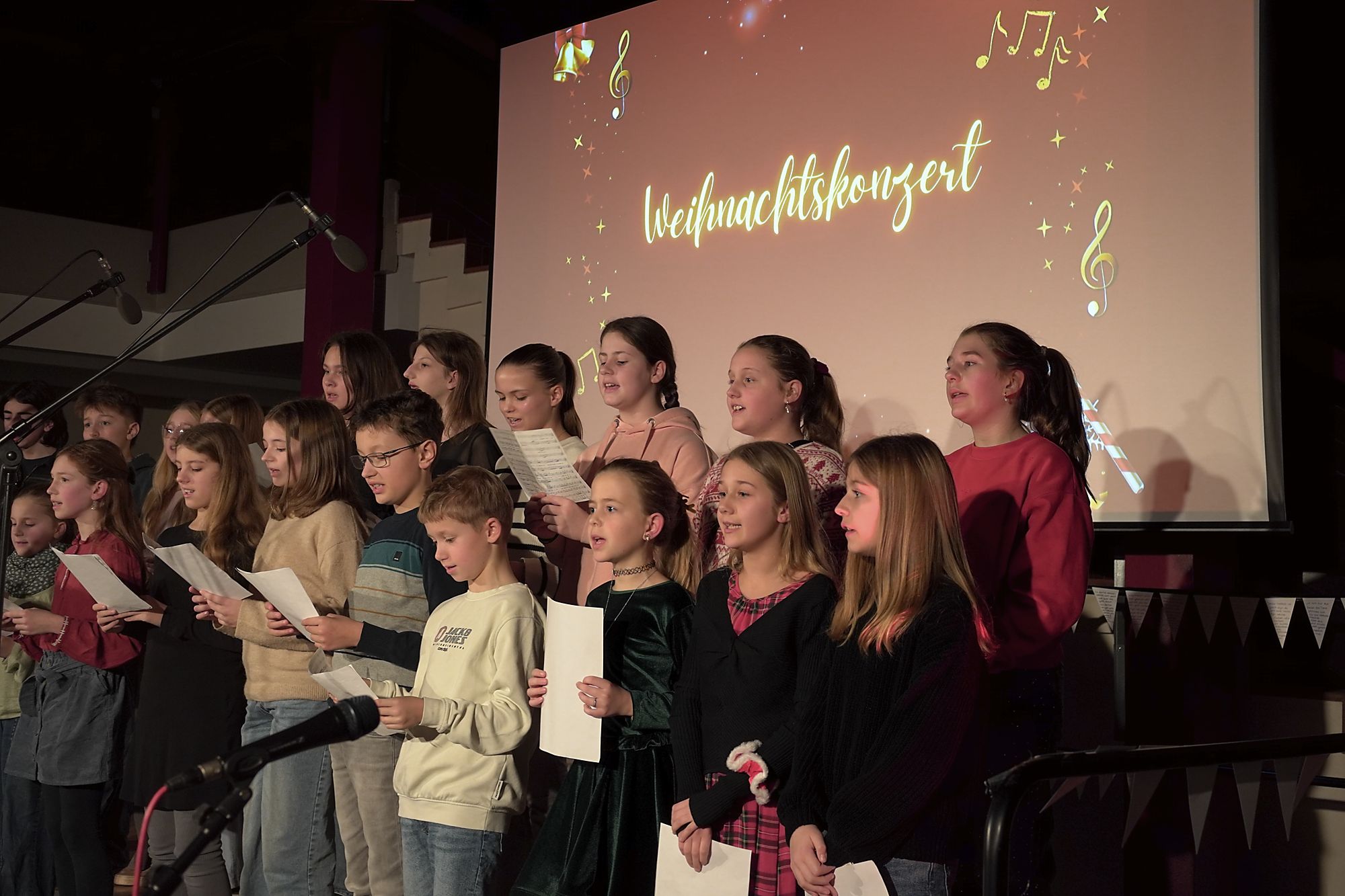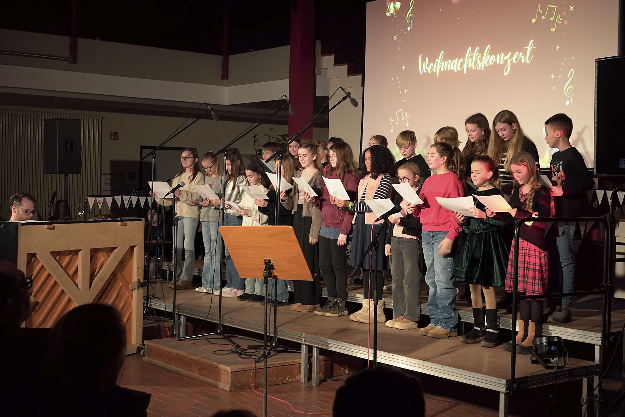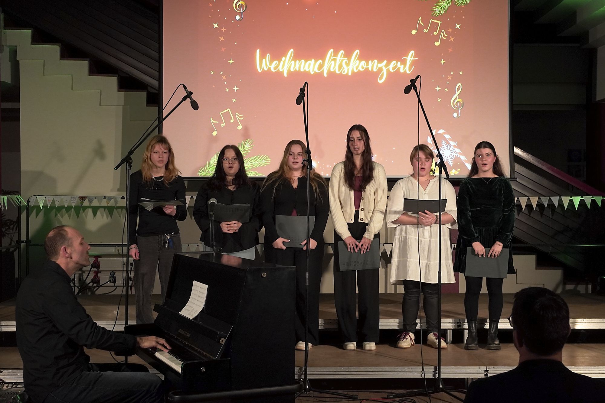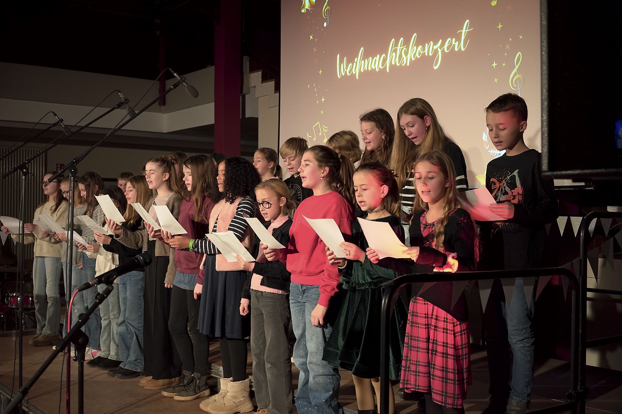 Das Programm bot eine Mischung aus mitreißenden Stücken und leisen Tönen, die auf Weihnachten einstimmten. Eröffnet wurde das Konzert vom 11er-Chor mit „California Dreaming“ und „Winter Wonderland“. Anschließend verzauberte der Unterstufenchor das Publikum mit dem Friedenskanon. Weitere Beiträge des 11er-Chors folgten, bevor die Klasse 5e mit „Stern über Bethlehem“ und „Hört der Engel helle Lieder“ begeisterte.