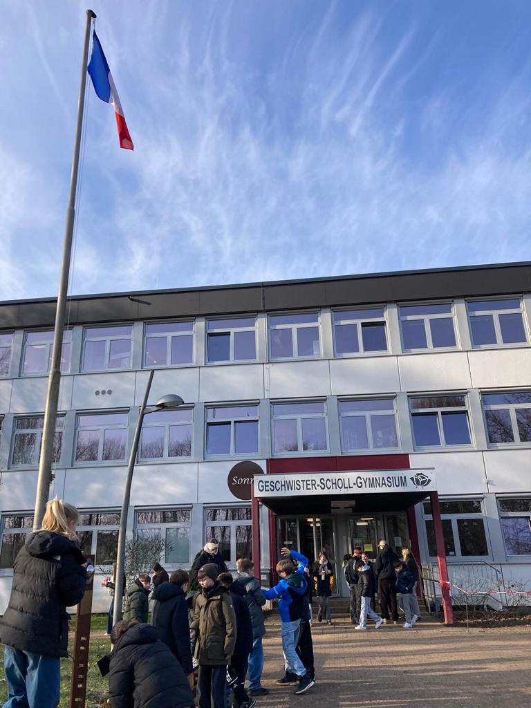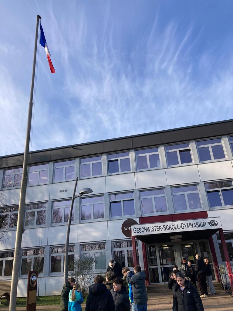 Anlässlich dieses Jubiläums feierte auch das Geschwister-Scholl-Gymnasium Lebach gemeinsam mit der Schulgemeinschaft, denn die französische Sprache nimmt an unserer Schule einen hohen Stellenwert ein. In beiden großen Pausen erfreuten sich die Schülerinnen und Schüler an Croissants und Pains au chocolat, begleitet von französischer Musik. Eine stimmungsvolle Dekoration in den Farben der französischen Nationalflagge verlieh dem Atrium ein besonderes Ambiente. Zusätzlich wehte die französische Flagge auf dem Schulhof.