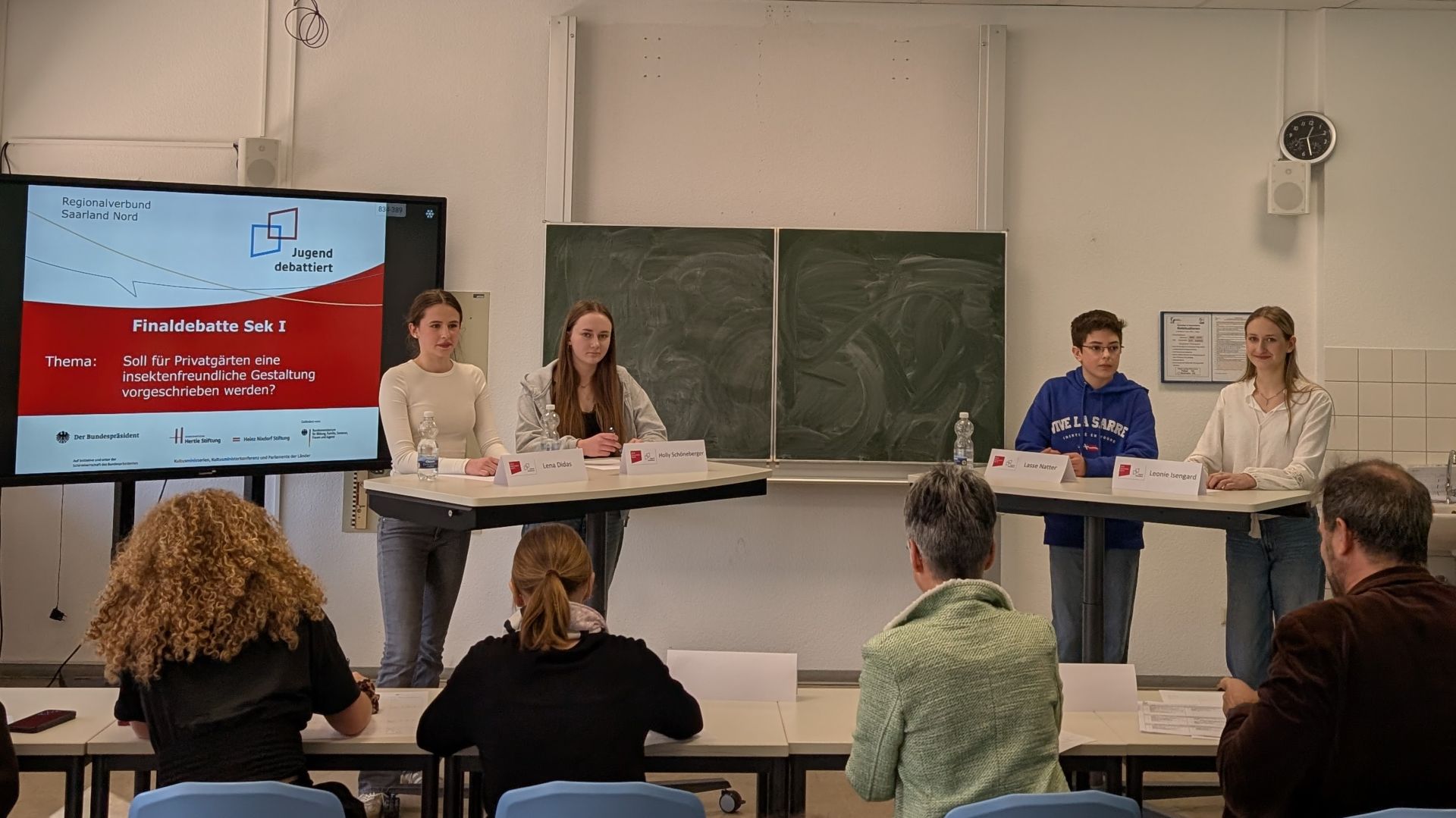 Aber zurück nach Sankt Wendel, zum Freitag, dem 28.02.2026: Holly und Henry debattierten in zwei Vorrunden zu Themen wie „Soll für Privatgärten eine insektenfreundliche Gestaltung vorgeschrieben werden?“, Nina bei den Älteren zu Themen wie „Soll eine Kontaktgebühr für Arztbesuche erhoben werden?“ und taten dies gut.