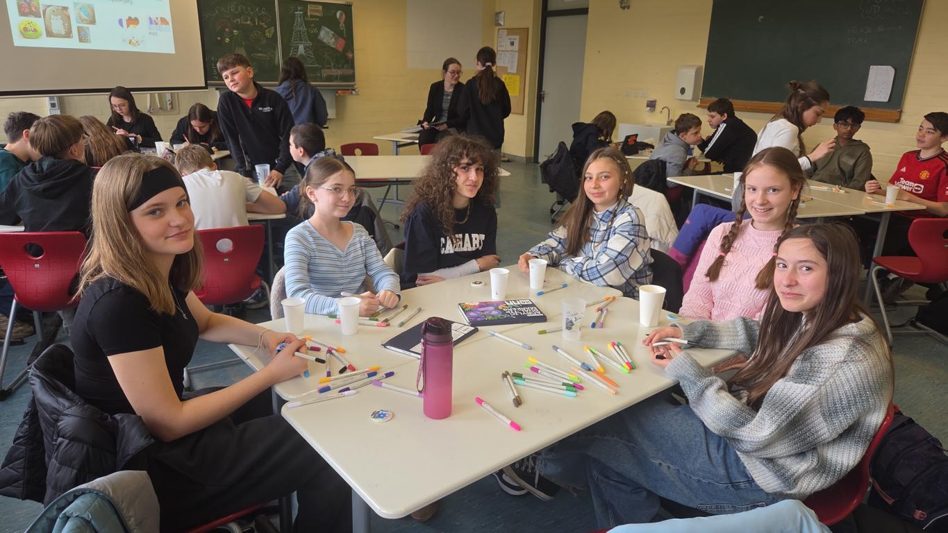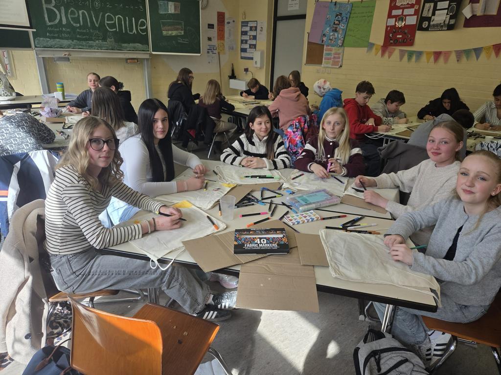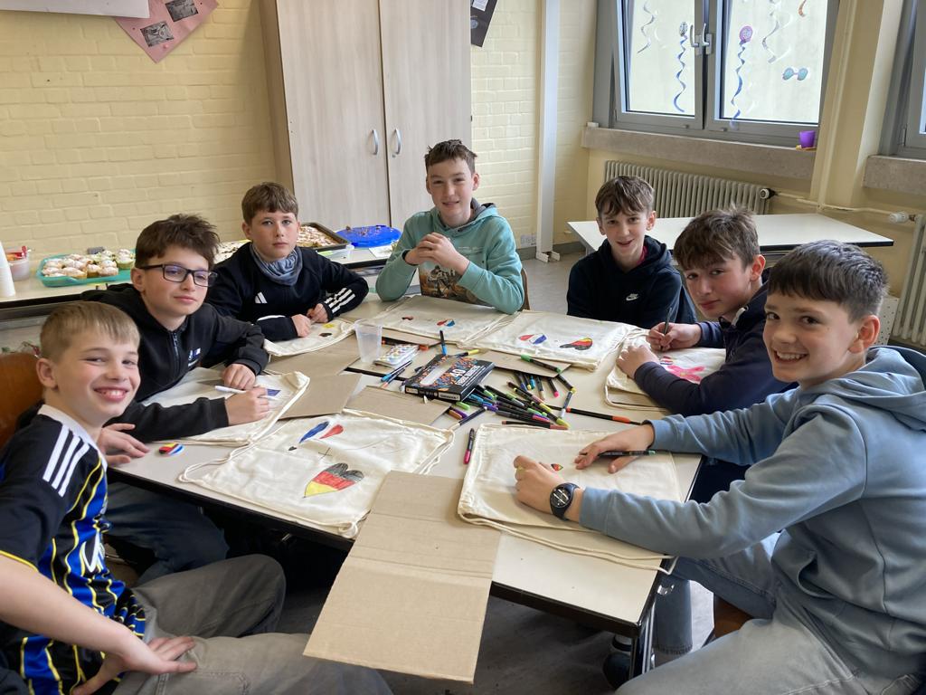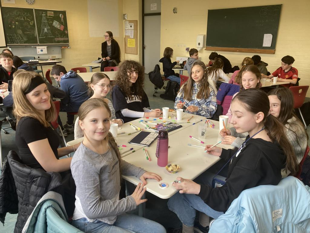 Im Anschluss arbeiteten alle Teilnehmenden in vier verschiedenen Ateliers, die thematisch ganz im Zeichen des Frühlings standen. Zunächst wurden Stoffbeutel gestaltet und anschließend Steine bemalt, die später verschenkt werden sollten. Dabei war der Kreativität keine Grenzen gesetzt. Vor allem bei der Übergabe der Geschenke gab es strahlende Gesichter: „Meine französische Austauschpartnerin hat mir einen tollen Stoffbeutel überreicht, der den Frühling und die deutsch-französische Freundschaft zeigt“, stellte Johanna Prediger aus der Klasse 6e fröhlich fest.