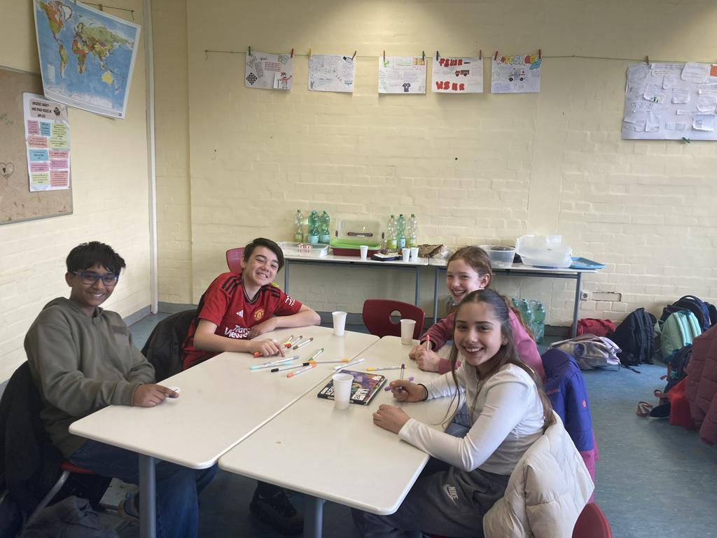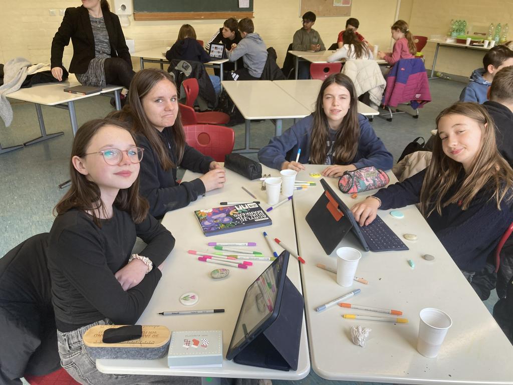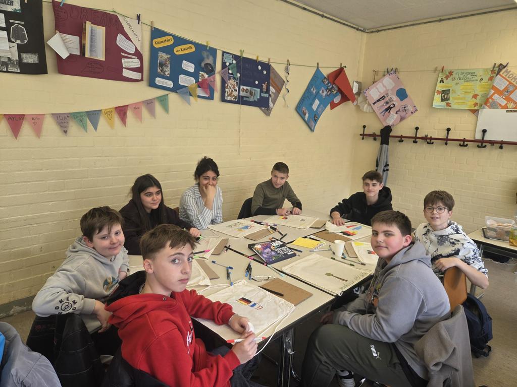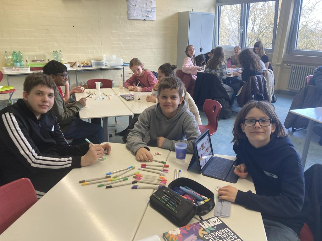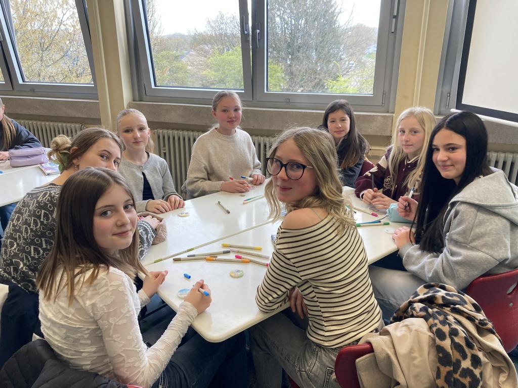 Im Anschluss arbeiteten alle Teilnehmenden in vier verschiedenen Ateliers, die thematisch ganz im Zeichen des Frühlings standen. Zunächst wurden Stoffbeutel gestaltet und anschließend Steine bemalt, die später verschenkt werden sollten. Dabei war der Kreativität keine Grenzen gesetzt. Vor allem bei der Übergabe der Geschenke gab es strahlende Gesichter: „Meine französische Austauschpartnerin hat mir einen tollen Stoffbeutel überreicht, der den Frühling und die deutsch-französische Freundschaft zeigt“, stellte Johanna Prediger aus der Klasse 6e fröhlich fest.