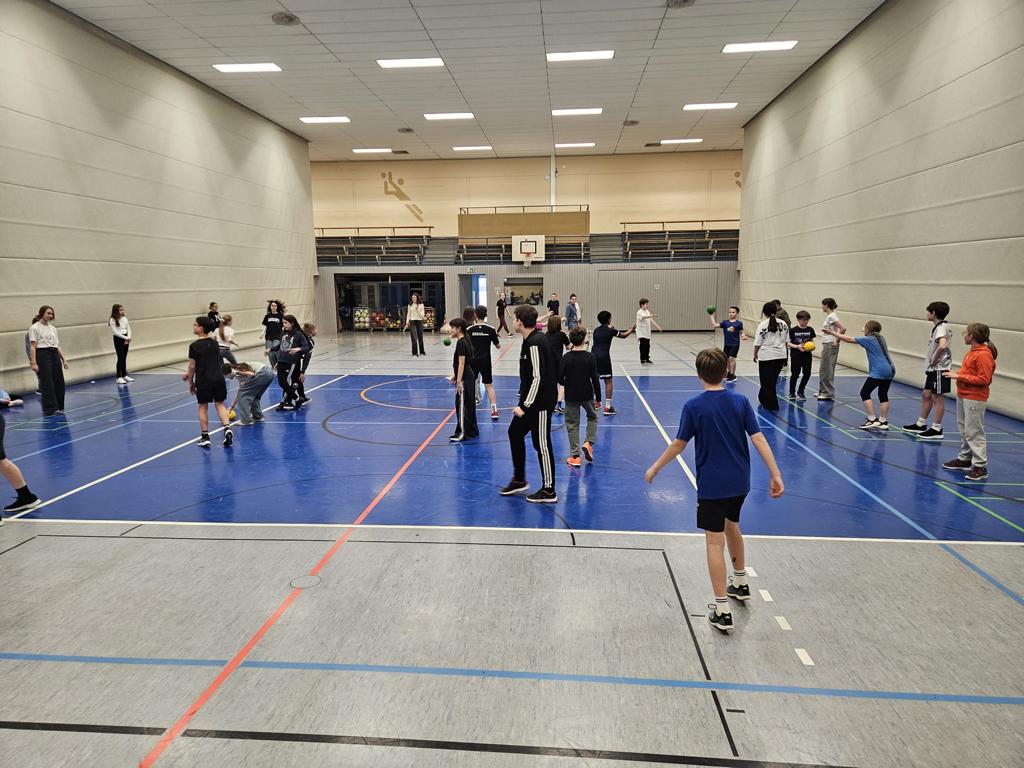 Nach einem gemeinsamen Mittagessen ging es sportlich weiter: In der Turnhalle standen verschiedene Spiele auf dem Programm, bei denen Teamgeist und Zusammenarbeit gefragt waren.